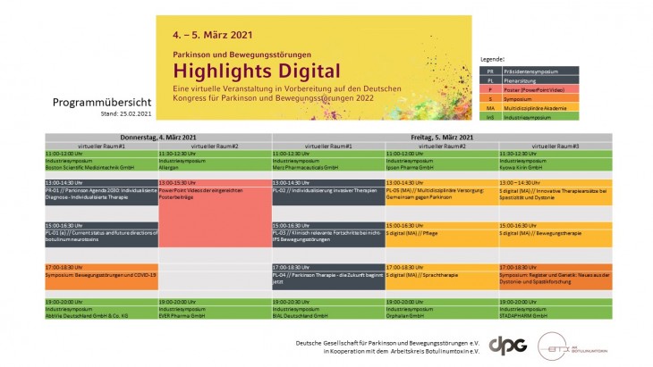 Für 2021 planen wir neu: Im März 2021 wollen wir einen Teil der vorgesehenen Beiträge und Präsentationen zu neuen Entwicklungen in den Themenbereichen Parkinson, Bewegungsstörungen und Botulinumtoxin in komprimierter Form an zwei virtuellen Kongresstagen darstellen.