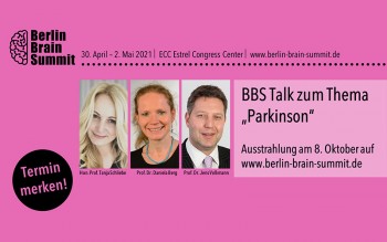 Vom 30. April – 2. Mai 2021 findet zum ersten Mal der Berlin Brain Summit 2021 im ECC Estrel Congress Center statt. In Vorbereitung auf den BBS 2021 widmet sich die erste digitale Ausgabe des „BBS Talk" dem Thema „Parkinson“. Unter der Moderation von Hon. Prof. Tanja Schliebe, Head of Publishing und Mitglied der Geschäftsleitung der Prime Public Media AG, werden Frau Prof. Dr. Daniela Berg, Direktorin der Klinik für Neurologie in Kiel, und Prof. Dr. Jens Volkmann, Klinikdirektor Neurologie des Universitätsklinikums Würzburg, die aktuellen Fragen rund um die Parkinson-Erkrankung in Deutschland diskutieren.